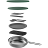 Комплект безусловно интересный и удобный. Но хочу добавить ложку дёгтя. Крышка у комплекта не термостойкая. Ей нельзя пользоваться при разогреве еды на газу, т.к. она из простой пластмассы. Сразу сократилась в диаметре и больше не закрывает сковородку, соответственно весь комплект рассыпается по сумке и т.д. пришлось крышку просто выбросить дома и возить все в рассылку в сумке. Причина использования крышки очевидна - 1. Я люблю готовить с паром от продуктов в собственном соку, как говорится. 2. На морозе даже самая простая яичница снизу горит, сверху холодная, с крышкой более менее.